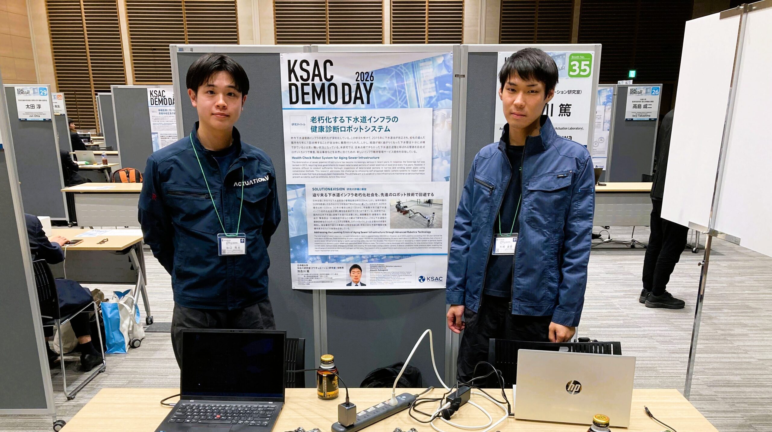 On April 14, KSAC DEMO DAY 2026 was held at the Grand Front Osaka Congrès Convention Center. D1 Mr. Taniguchi and M2 Mr. Sugizaki introduced the commercialization of our research on inspection robots for sewer force mains.